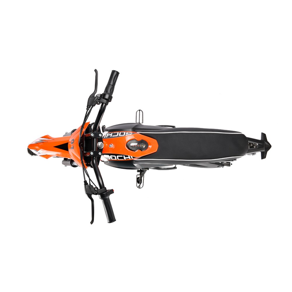 Мощность двигателя составляет 1500 Вт позволяет развить скорость до 38 км/час и проехать на одной подзарядке до 50 км пути. Техника оснащена сверхпрочной трубчатой рамой, на передней панели имеет спидометр. Динамичное скоростное движение обеспечено 10-ти дюймовыми прочными колесами, по внешнему виду напоминающие внедорожные. Сиденье водителя – большое и мягкой, не вызывает усталости ездока и перенапряжения позвоночника. В передней части размещена линзовая фара дающая возможность движения в темное время суток. Инновационный АКБ имеет высокую степень влагозащиты. Из дополнительных элементов следует отметить наличие сигнала, больших кнопок управления, сигнализации и подножки для удобной устойчивой парковки.