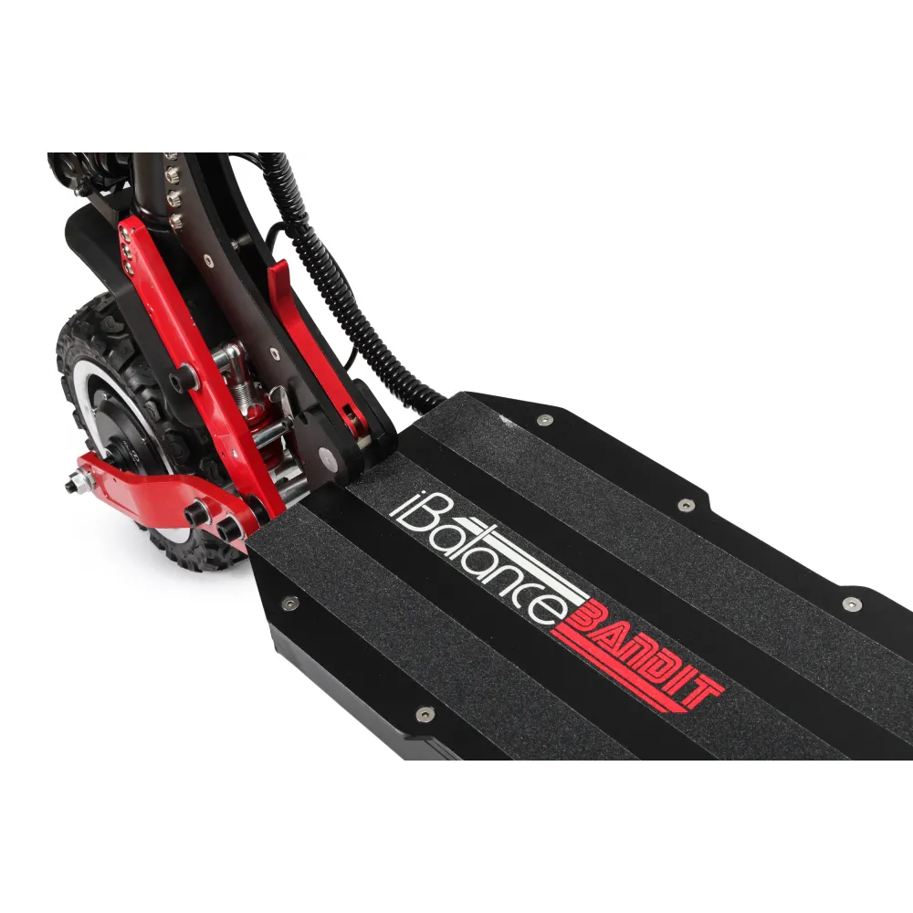 Электросамокат iBalance Bandit мощный полноприводный агрегат, который подойдет для передвижения по любому бездорожью. Прочная массивная конструкция вызывает доверие, максимальная нагрузка на устройство 150 кг. С усиленной амортизацией передних и задних колес электросамокат имеет плавный ход даже по гравийной дороге. Колеса диаметром 11 дюймов, с протекторными внедорожными шинами. В комплекте идут запасные шоссейные шины.