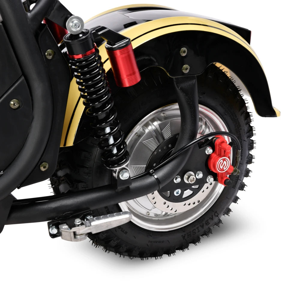 Мощность мотора 2000 Вт (номинал) обеспечивает разгон до 45 км/ч и подъемов до 20–25° даже при полной нагрузке 260 кг, но на неровностях или в дождь скорость падает. Аккумулятор Li-ion 60V дает заявленный пробег 60 км в идеале (Eco-режим, ровный асфальт), балансируют скорость/запас хода, снижая потребление на 20–30% в Eco. Тормоза — гидравлические дисковые (диаметр 120–140 мм), эффективны на мокром асфальте; энергоэффективность высока благодаря рекуперации (5–10% возврата энергии); зарядка (7 часов) стандартна для Li-ion без потери срока службы.