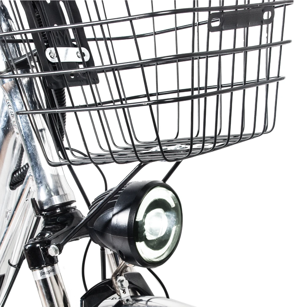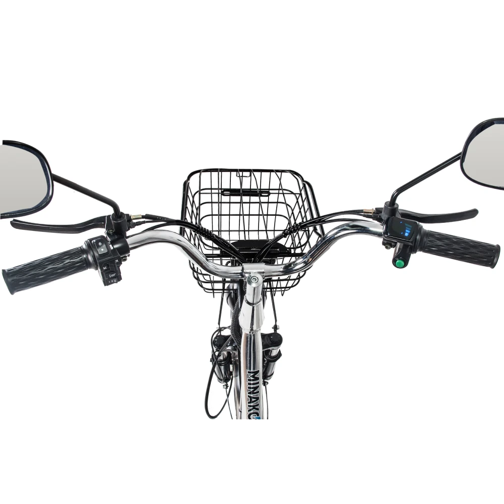 Комплектация велосипеда довольно богатая. В отличие от конкурентов, велосипед по умолчанию имеет зеркала заднего вида, корзинку на руле, подножку и багажник, и это не смотря на то, что он комплектуется дополнительной батареей!