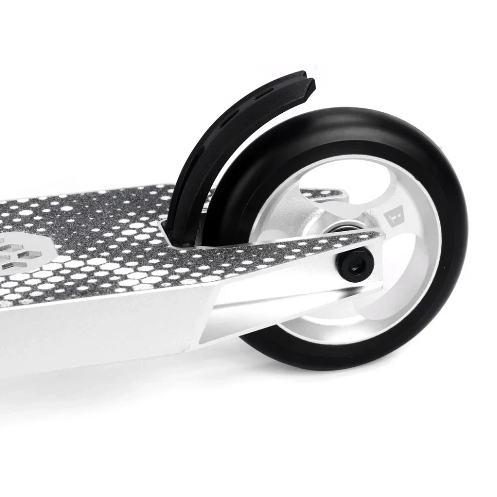 Комплектуется 110-миллиметровыми колесами, которые гарантируют отличное сцепление с поверхностью и плавное передвижение по скейтпаркам и уличным трассам. Черный цвет колес и серый цвет самоката создают неповторимый стиль и выделяют его среди других моделей.